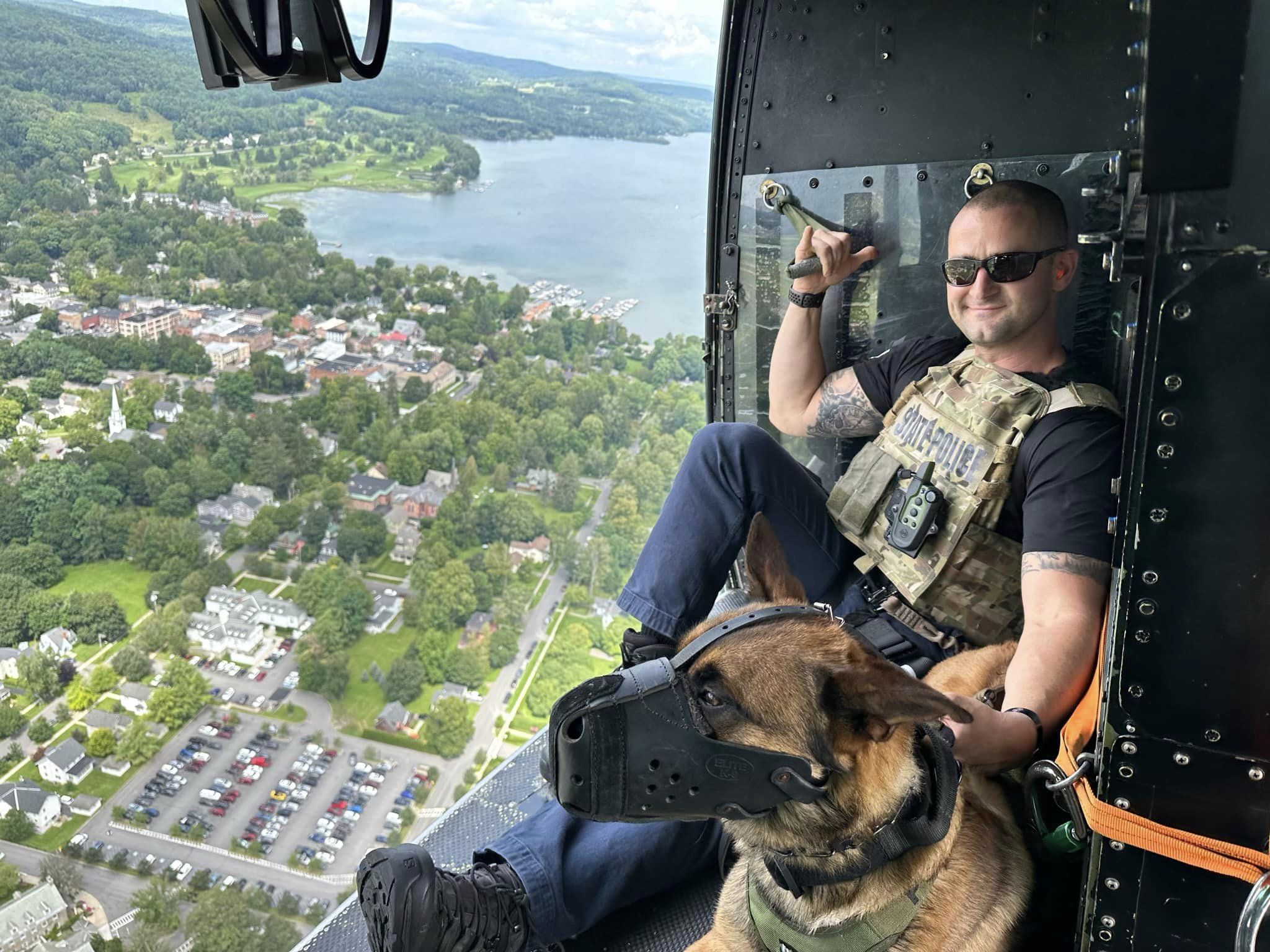 (Larry’s sister Shannon, with K9 Gleason and his handler, Trooper Anthony Cumm)