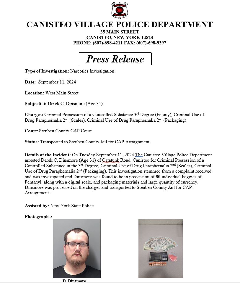Categories Home Page Headlines Local News Canisteo Man Facing Charges Of Fentanyl Possession Post author By Brian O'Neil Post date September 12, 2024 Share on FacebookTweet ← Alfred Mayor Responds To Statement From Paul Griffith’s Attorney → Arkport Asking For Hornell Police – To Help Ticket Speeding Drivers