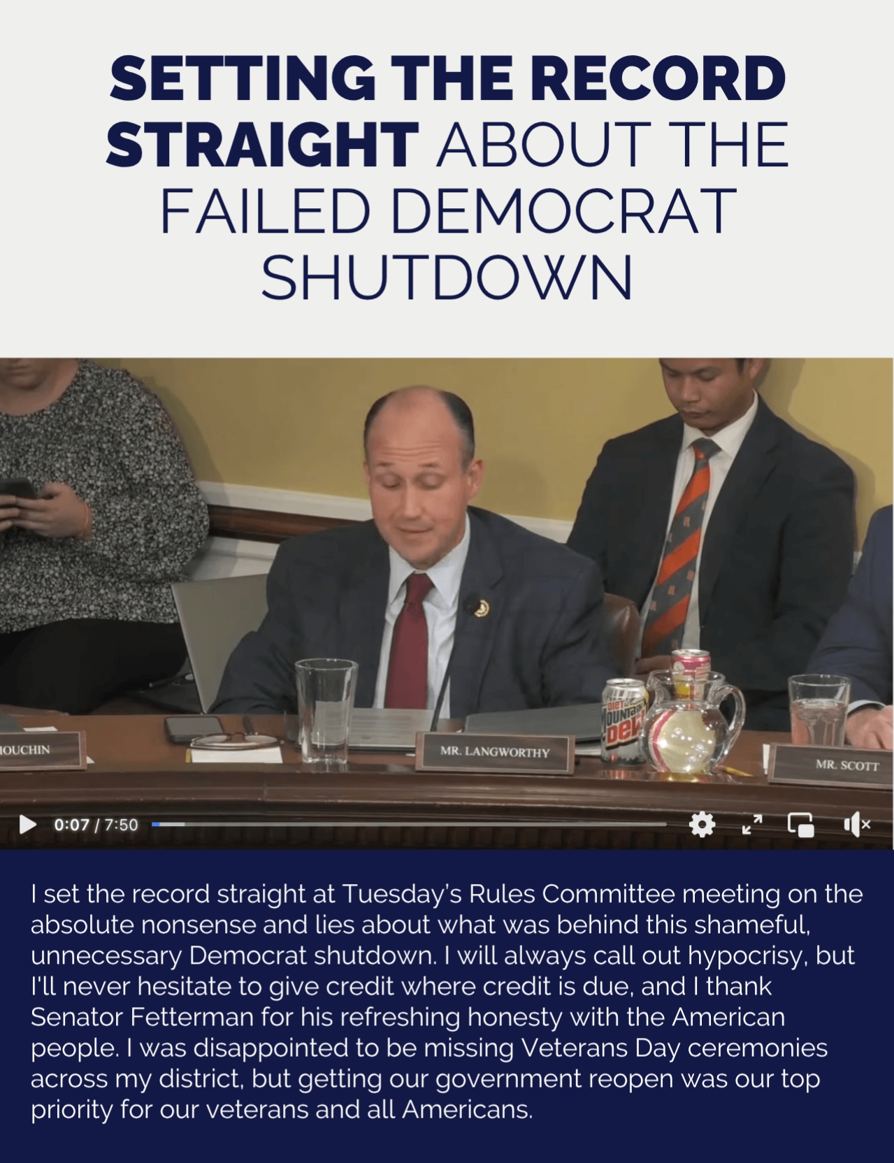 They weren’t trying to end the shutdown–they were reveling in the chaos because they believed it gave them a political advantage. That’s not a partisan accusation; it’s a fact. And you don’t have to take my word for it. While Senators Schumer and Gillibrand were leading the effort to keep the government shut down, Pennsylvania Senator John Fetterman courageously broke ranks and called it what it was: a Democrat-manufactured shutdown.