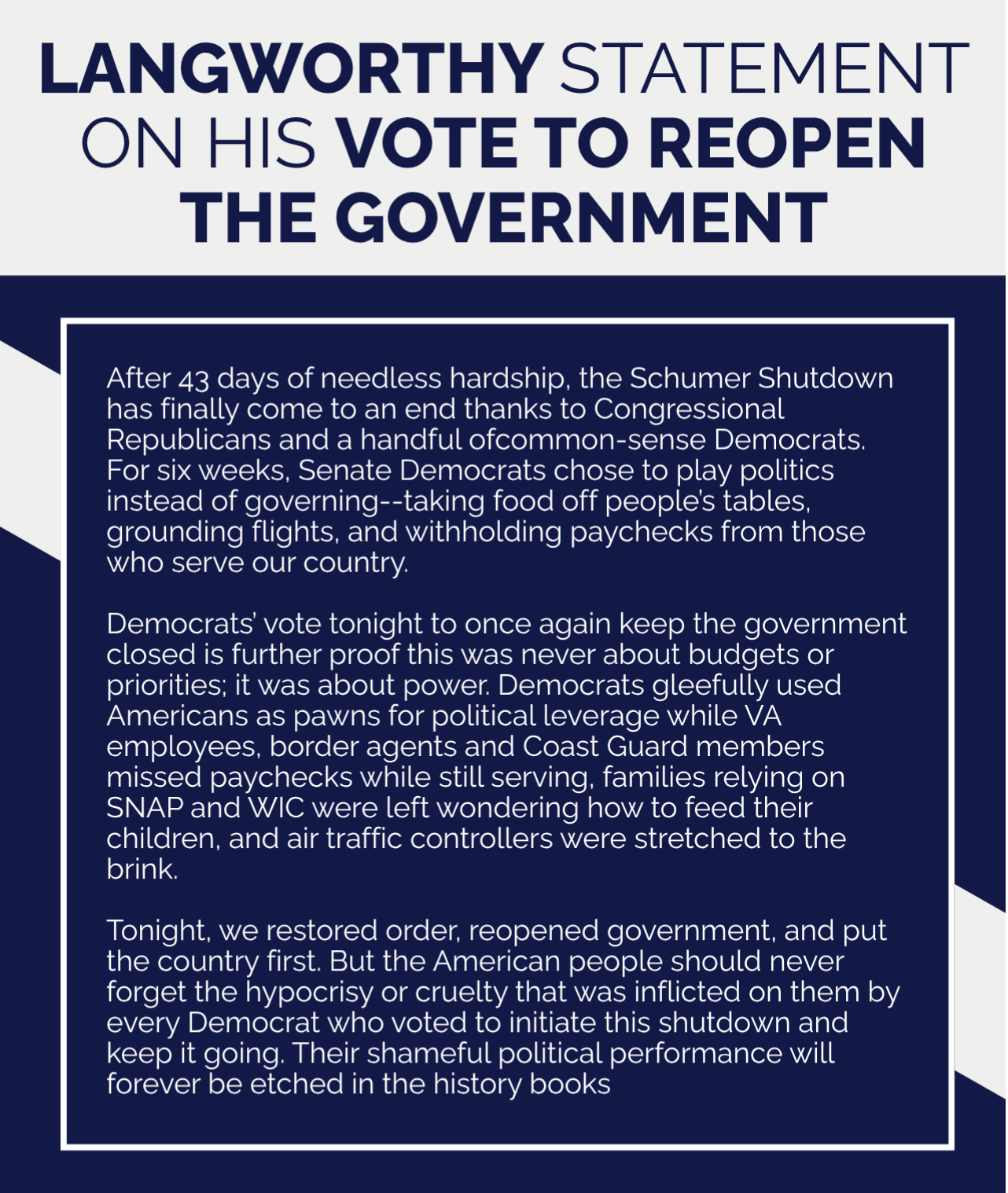 For six long weeks, Senate Democrats chose politics over governing–taking food off people’s tables, grounding flights, and withholding paychecks from the men and women who serve our nation. They used hardworking Americans as pawns for political leverage while VA employees, border agents, and Coast Guard members worked without pay, families relying on SNAP and WIC worried about feeding their children, and air traffic controllers were stretched to the brink.