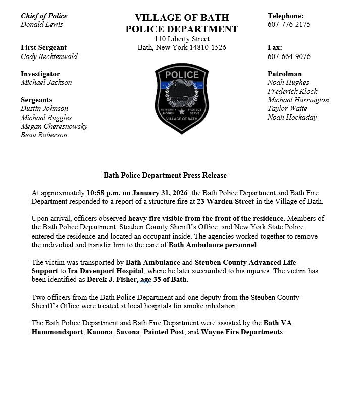 Categories Home Page Headlines Local News Fatal Fire In Bath Post author By Brian O'Neil Post date February 2, 2026 February 2, 2026 Share on FacebookTweet ← Langworthy’s Weekly Newsletter, February 2, 2026 → Notice Of Annual 30-day Period To Request Inclusion Of Agricultural Land Within An Existing Agricultural District In Steuben County