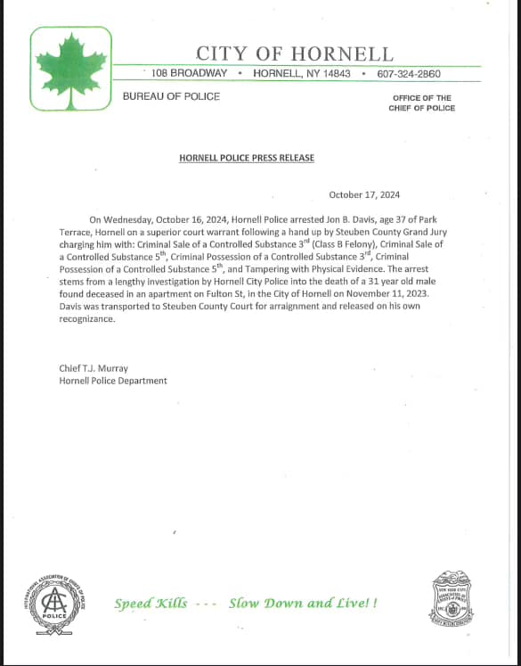 Categories Home Page Headlines Local News Hornell Police Charge Suspect For Allegedly Selling Drugs, That Led To Someone’s Death Post author By Brian O'Neil Post date October 18, 2024 October 18, 2024 Share on FacebookTweet ← Hornellsville Man Charged For Allegedly Storing Property, Reportedly Stolen From Erie Co → Friday Night Football Scores, From October 18, 2024