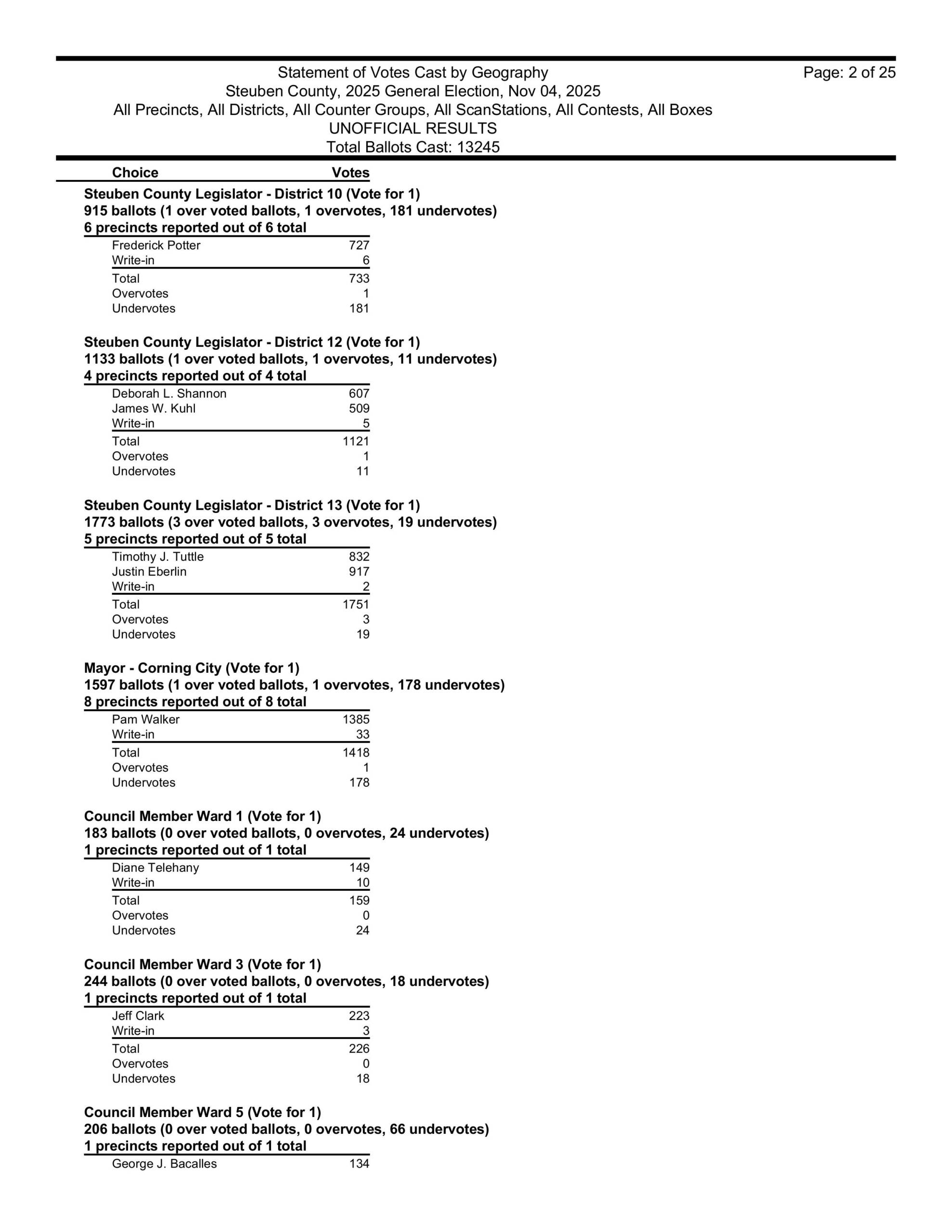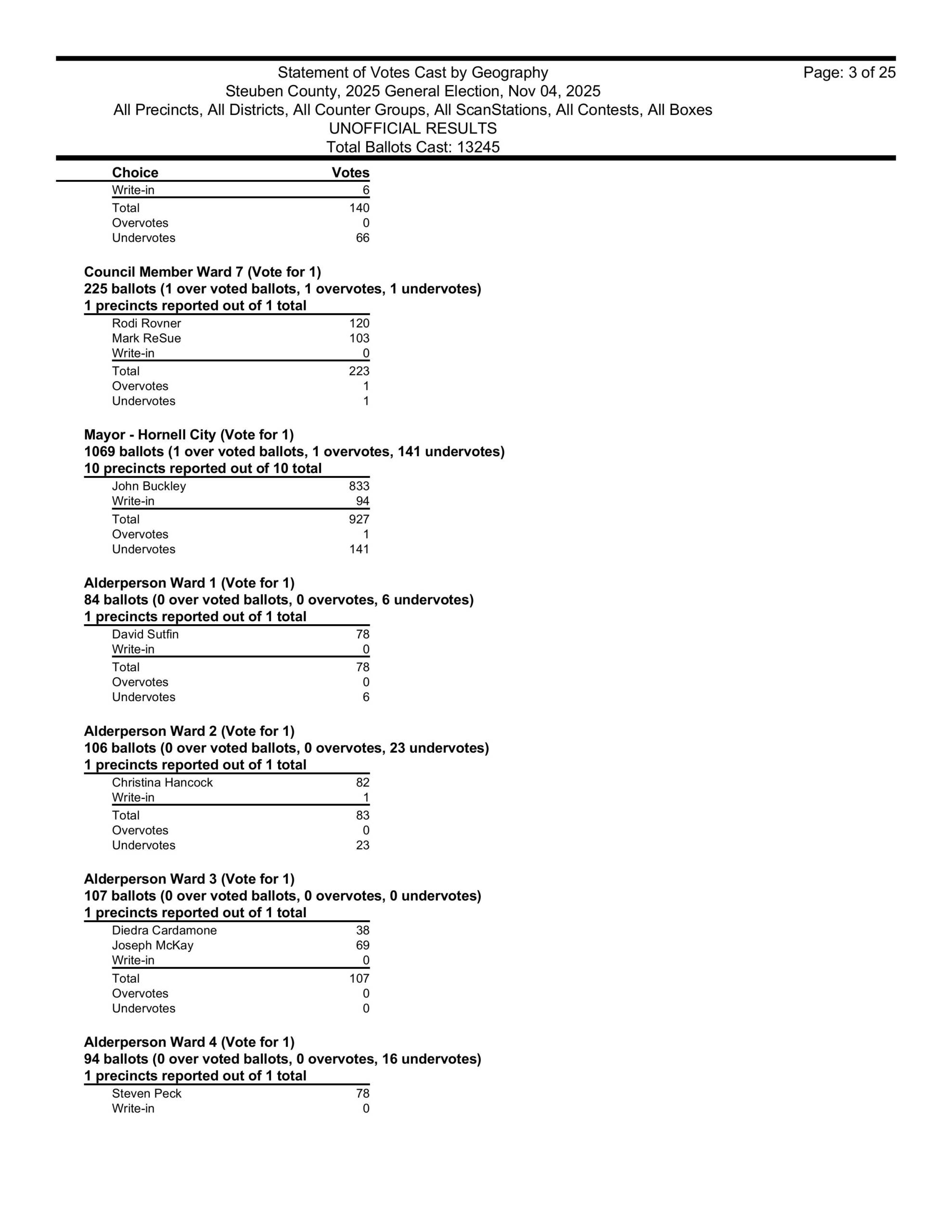 Hornell Mayor John Buckley pulled in 833 votes over his write in opponent Frederic Voss. There were 94 write-in votes, thought we don’t know yet, how many were for Voss. It was a good night for the Hornell Republicans on the Common Council. They won every seat except in the 10th Ward, which has been held for decades by Democrat John Carbone.