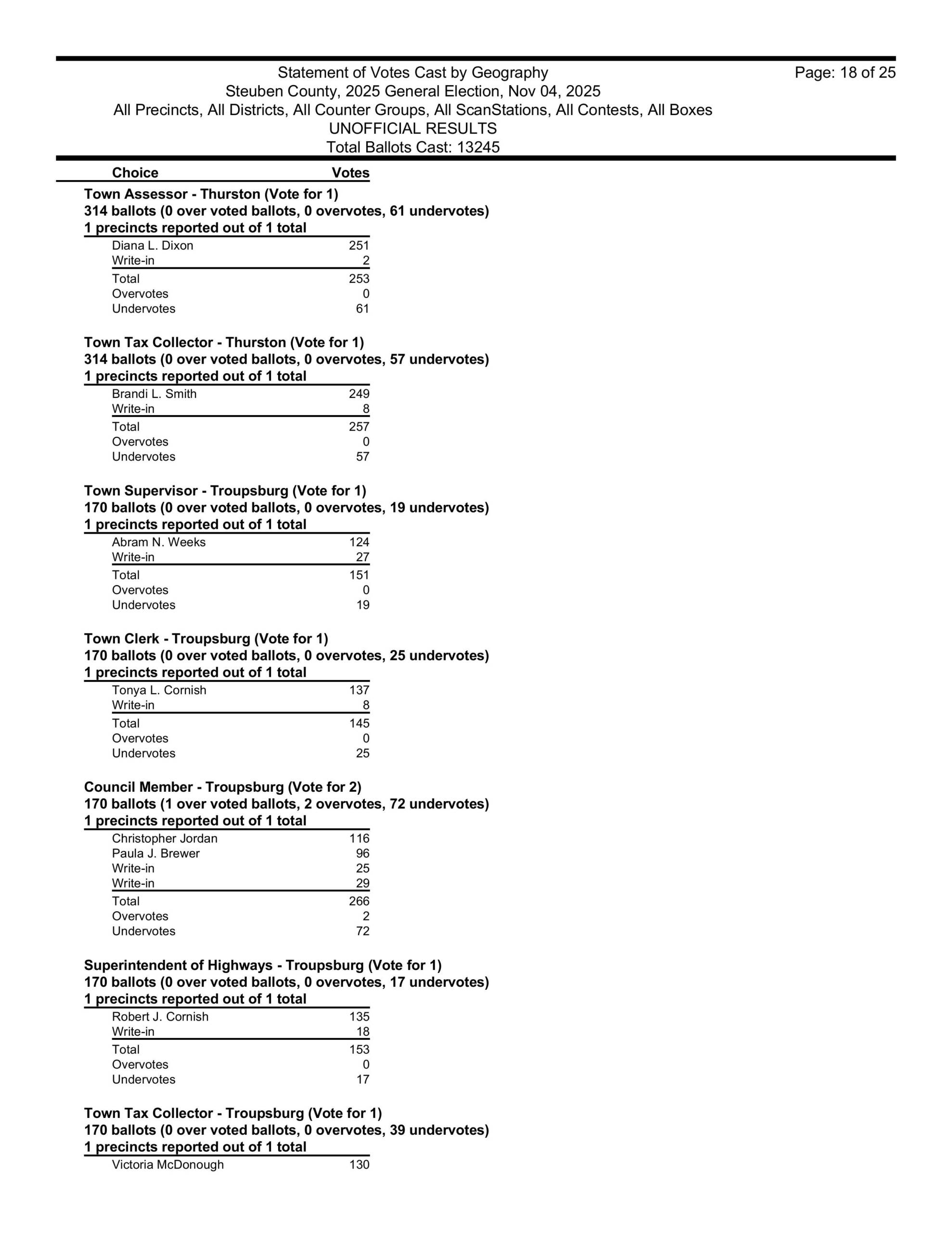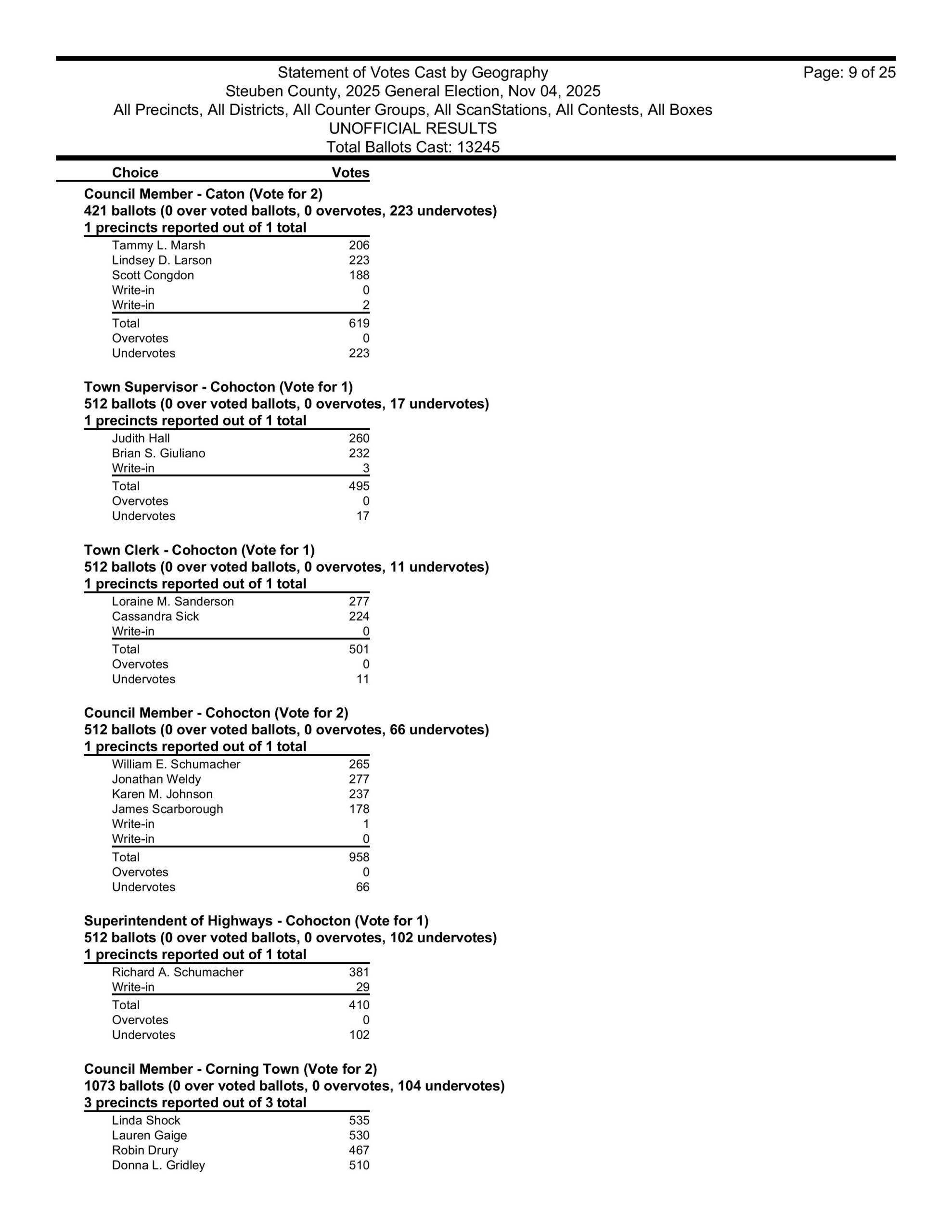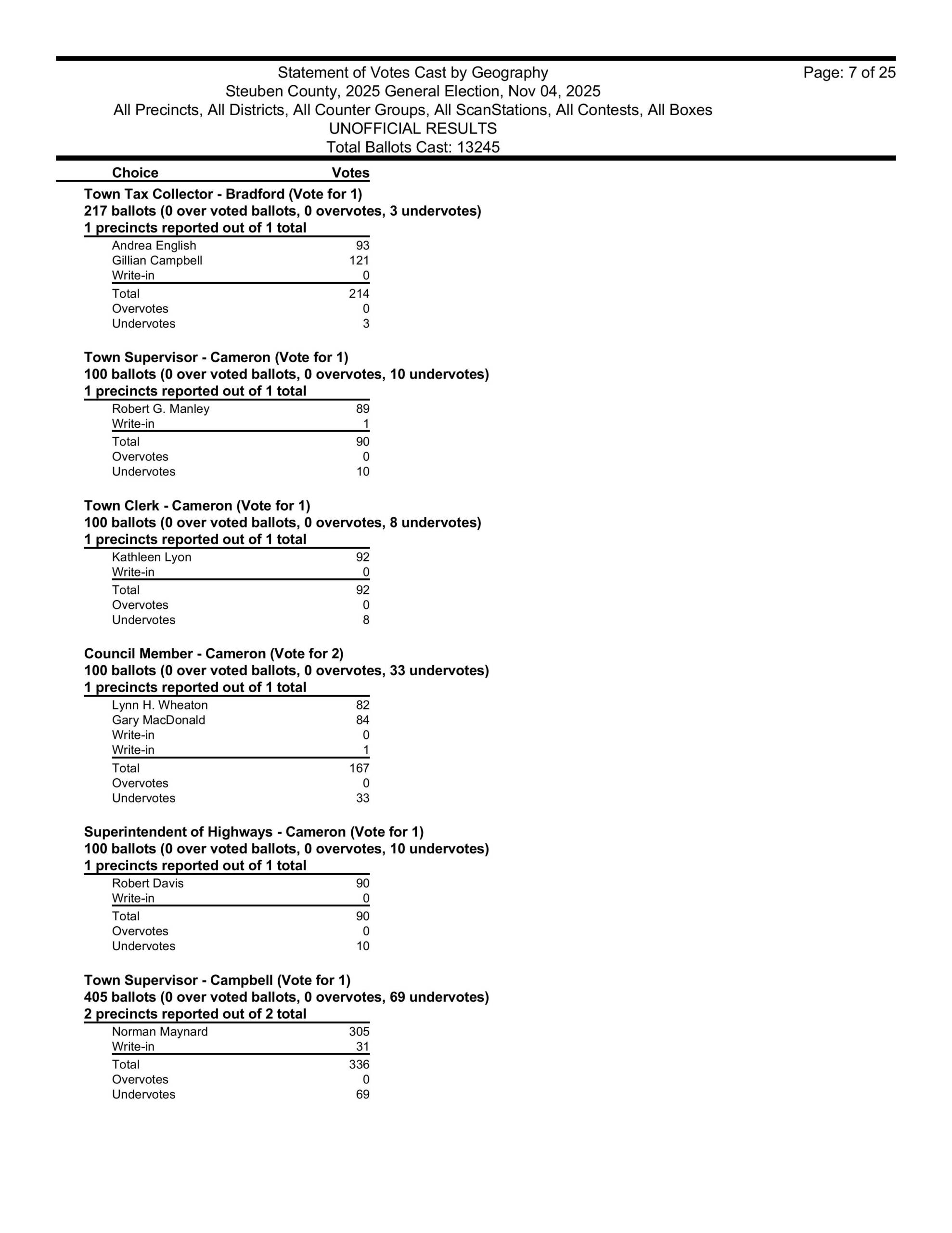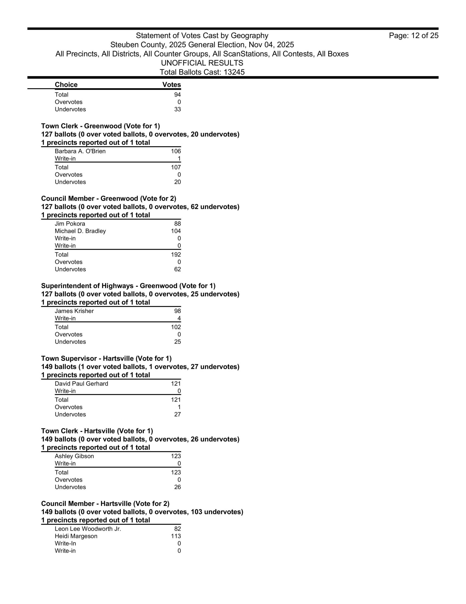 in Hartsville, David Gerhard won the supervisors race. He took over for his wife Kristi, who, sadly, died of cancer in September 2024. The winner of the Hartsville town clerk’s race was Ashley Gibson and the winners of the town board seats in Hartsville were Heidi Margeson and Leon Woodworth. Also, Ian Henderson won the Hartsville Highway Superintendent’s race once again.