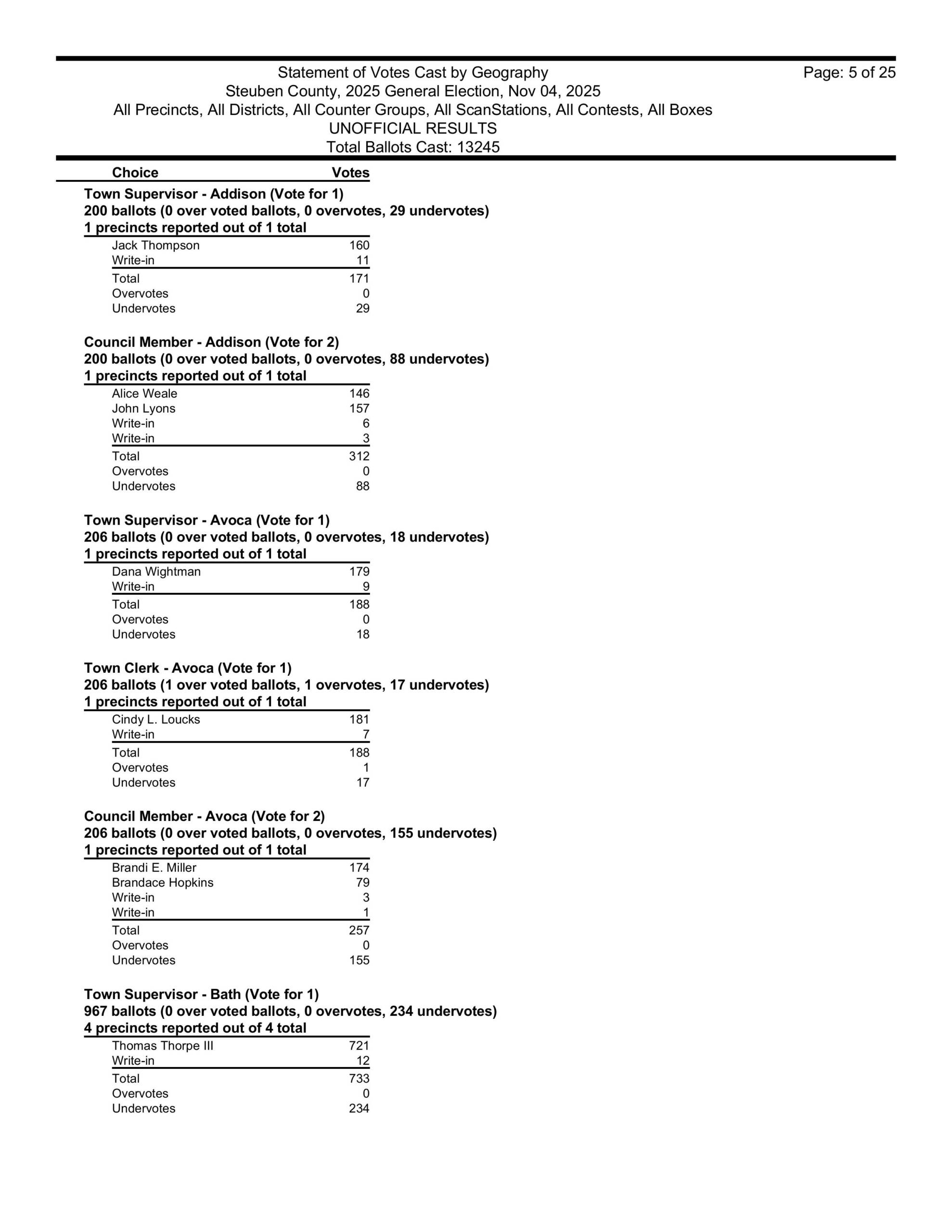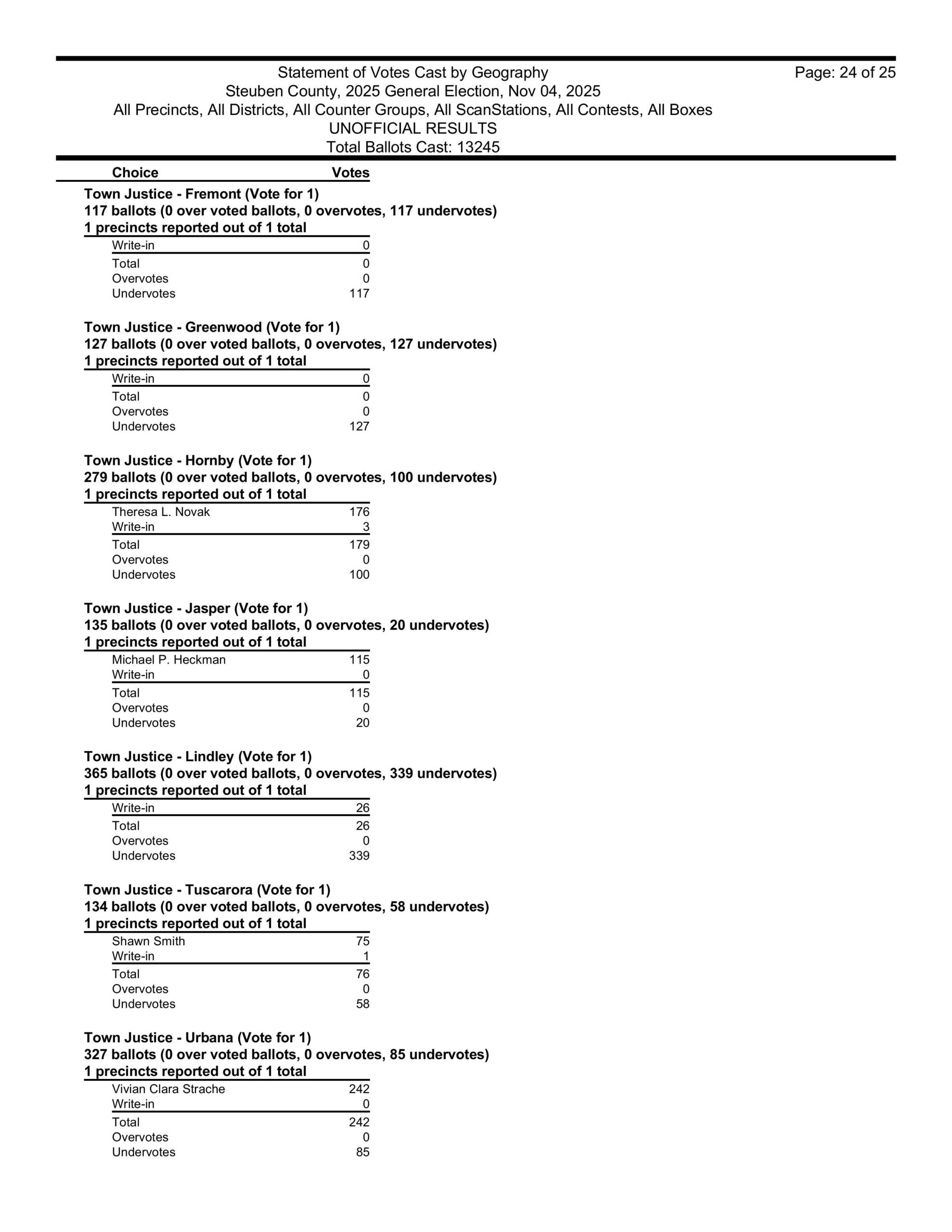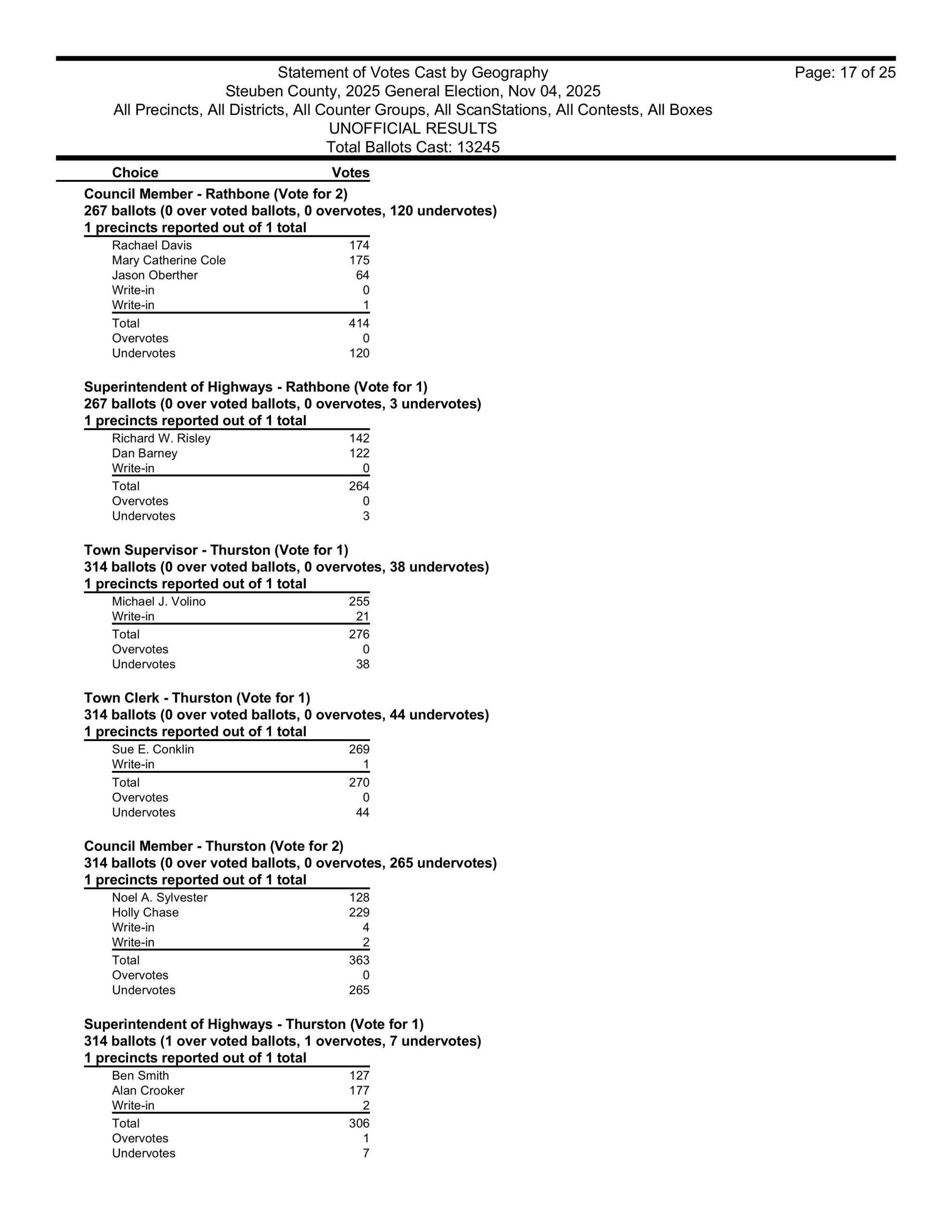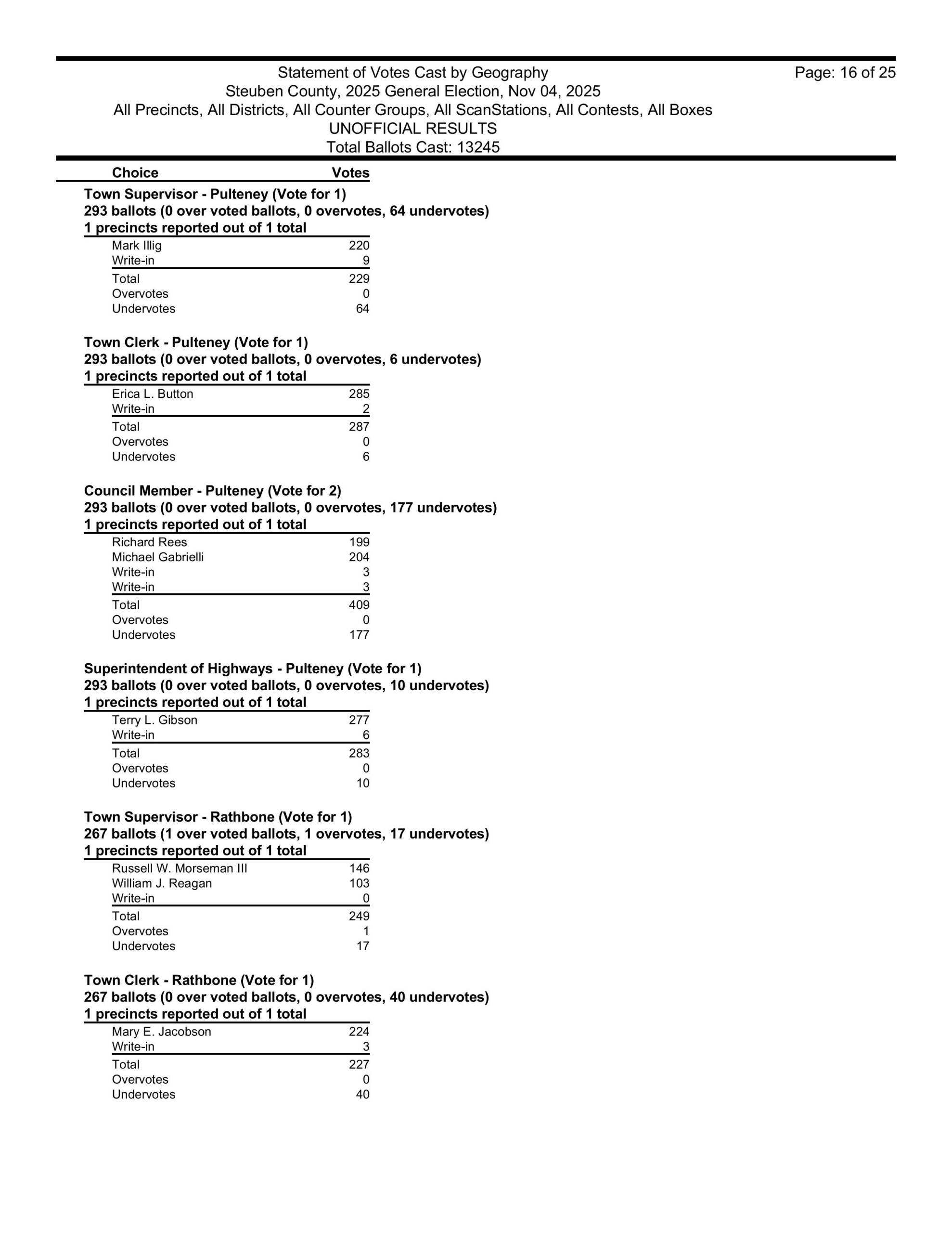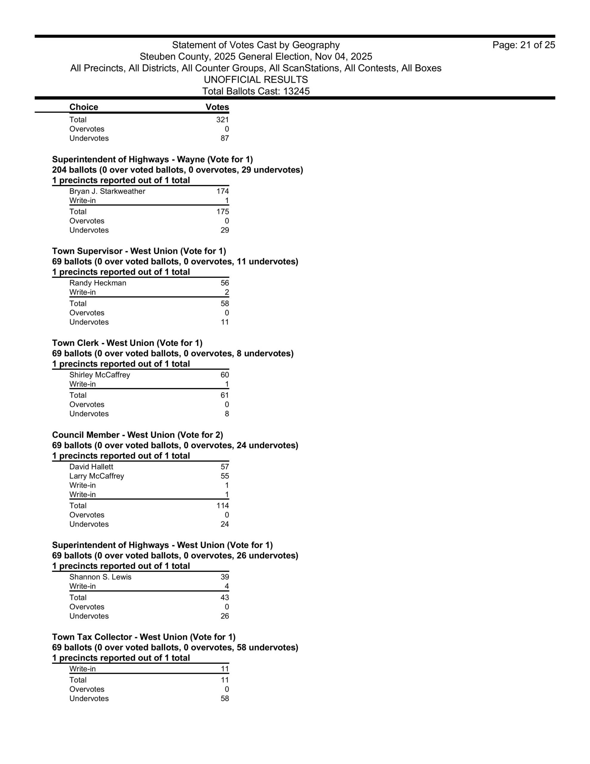 in Hartsville, David Gerhard won the supervisors race. He took over for his wife Kristi, who, sadly, died of cancer in September 2024. The winner of the Hartsville town clerk’s race was Ashley Gibson and the winners of the town board seats in Hartsville were Heidi Margeson and Leon Woodworth. Also, Ian Henderson won the Hartsville Highway Superintendent’s race once again.