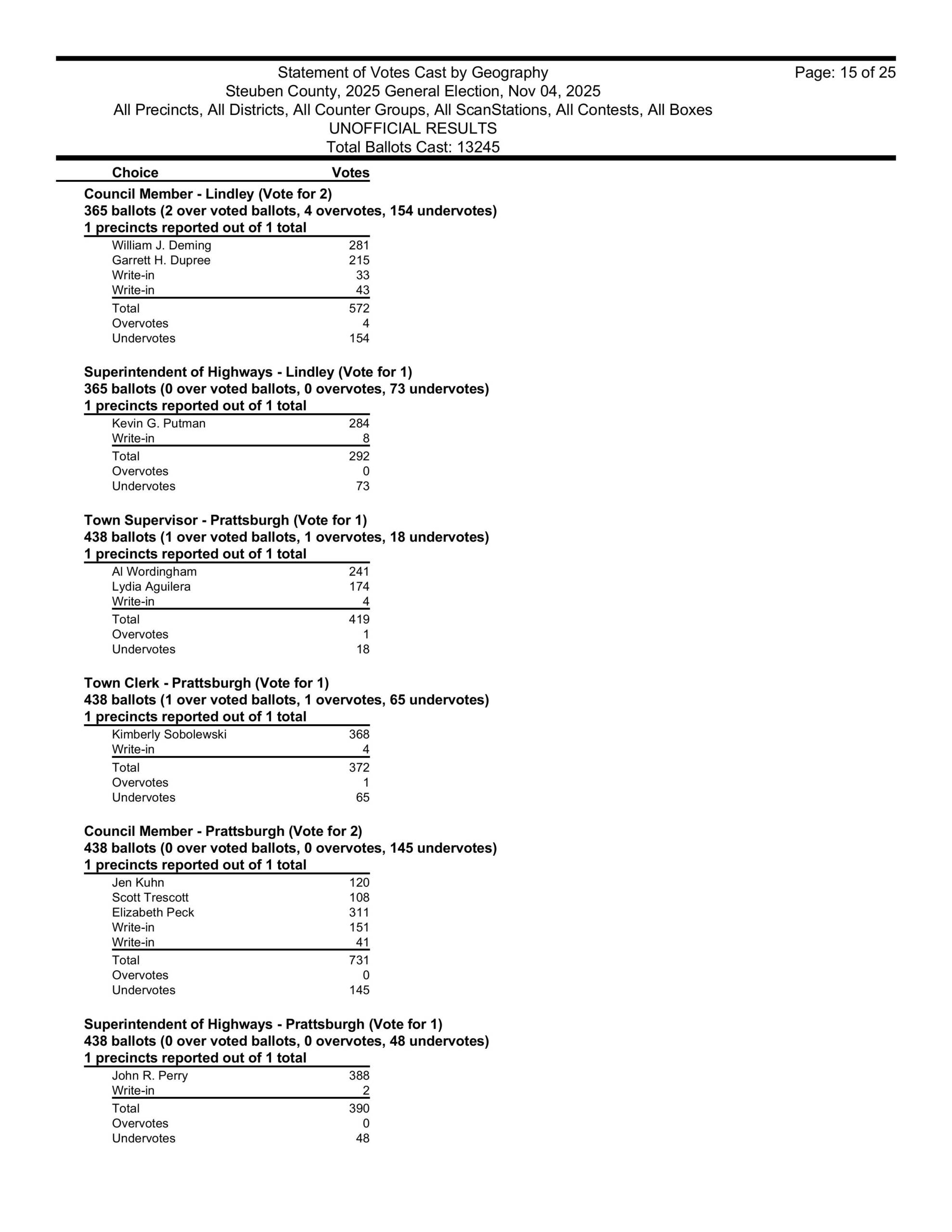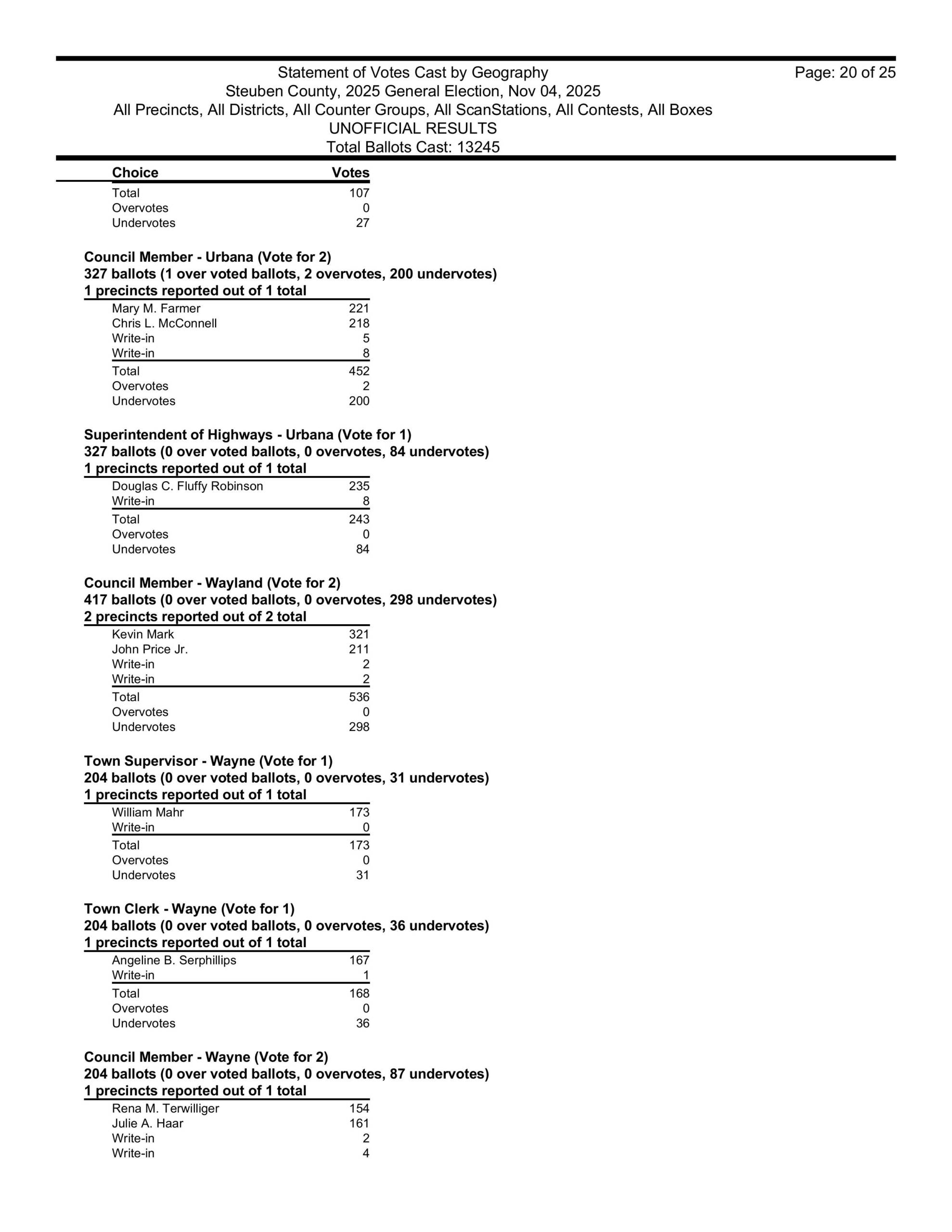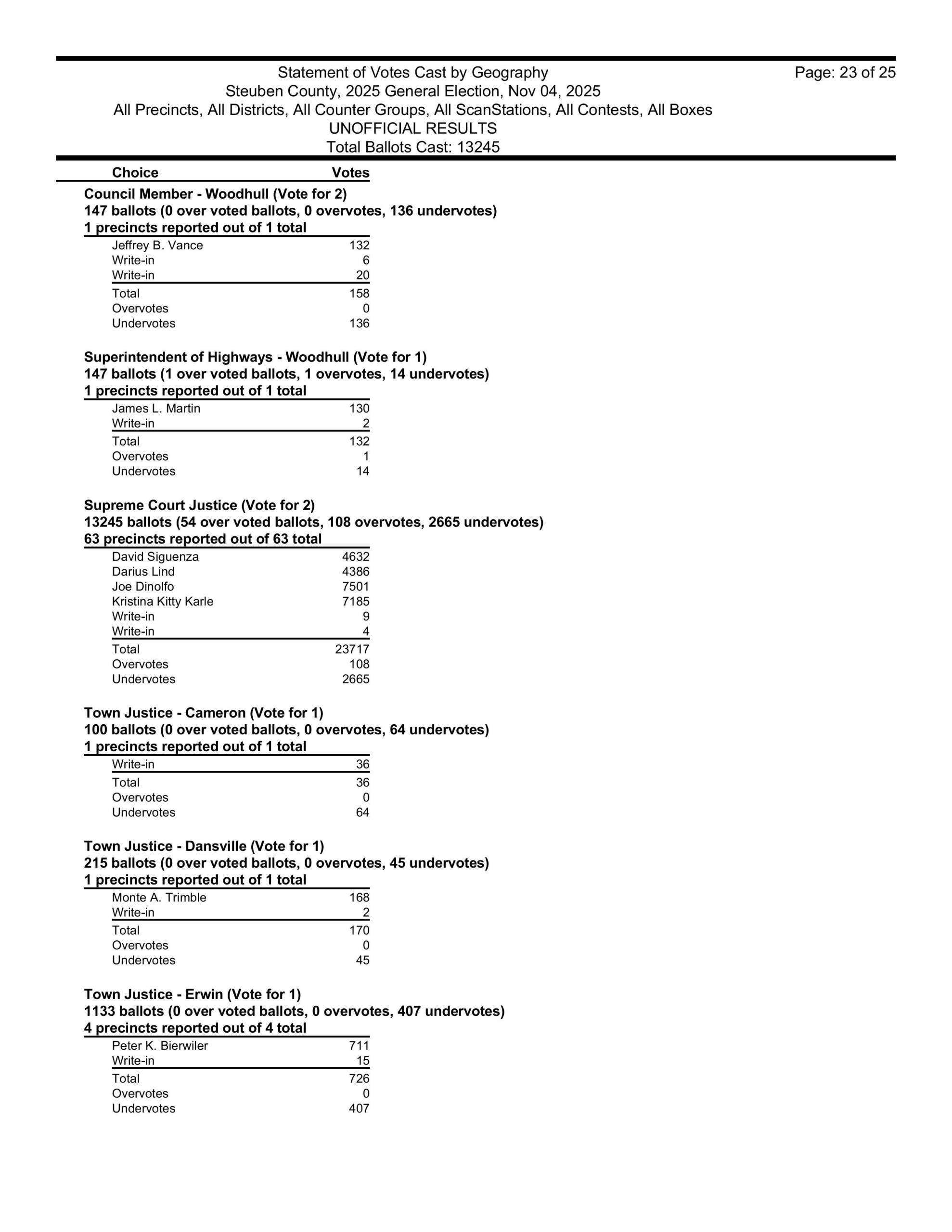 Canisteo Town Supervisor Joe Harrington won reelection last night, getting 192 votes. Also in Canisteo, James Dennis won his seat also on the Canisteo Town Board, getting 230 votes.