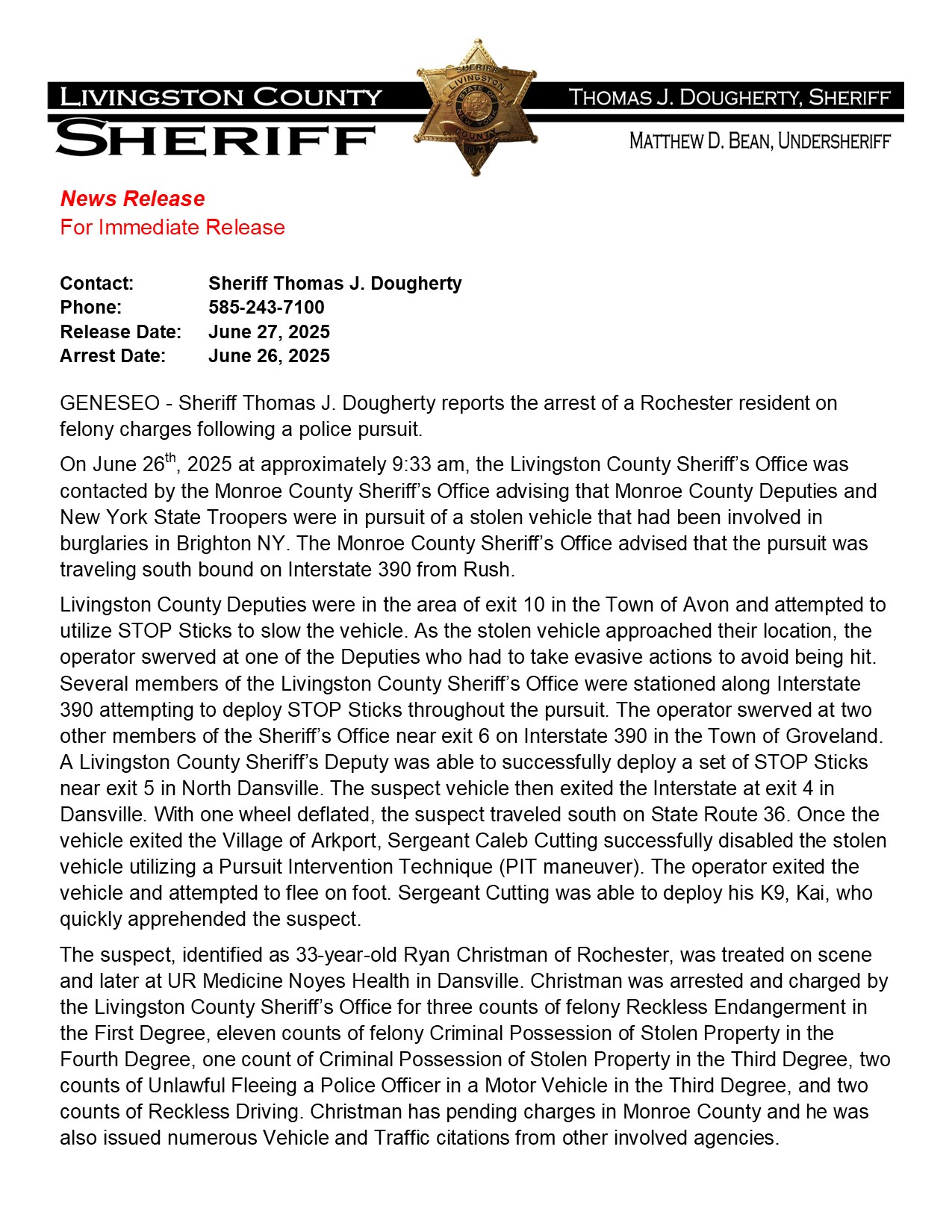 Categories Home Page Headlines Local News Livingston County Sheriff’s Statement About Thursday’s Arkport Arrest Post author By Brian O'Neil Post date June 27, 2025 June 27, 2025 Share on FacebookTweet ← Vehicle Pursuit Goes From Brighton Into Arkport → Canaseraga Man Is Accused Of Allegedly Committing Armed Robbery