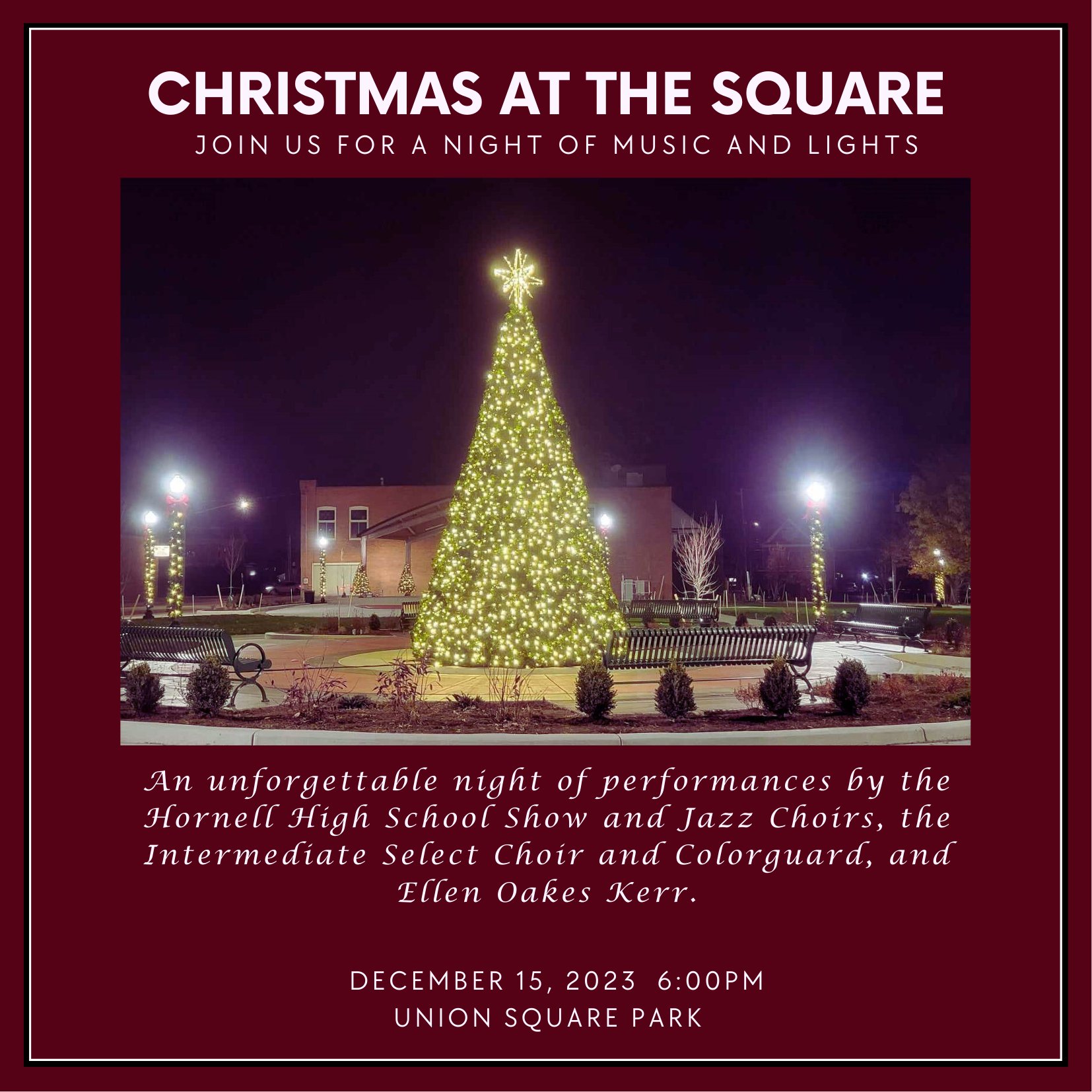 HORNELL, NY – Hornell Mayor John Buckley says there’s going to be the first annual Christmas at the Square concert at the new Union Square Park. That will be December 15 at 600 that evening. There is no charge for admission and seating will be available.