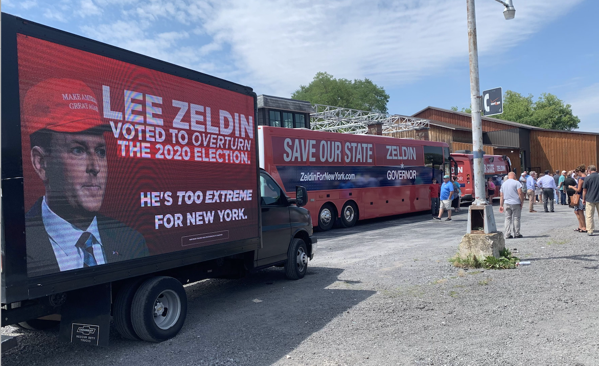 This weekend, the New York State Democratic Party deployed a mobile billboard across New York State to remind voters that Lee Zeldin is a far-right, anti-democratic extremist who voted to overturn the 2020 presidential election. The mobile billboard attended every Zeldin event, making sure voters knew he happily pushed Donald Trump’s “Big Lie” and worked to throw out their votes in a free and fair election.