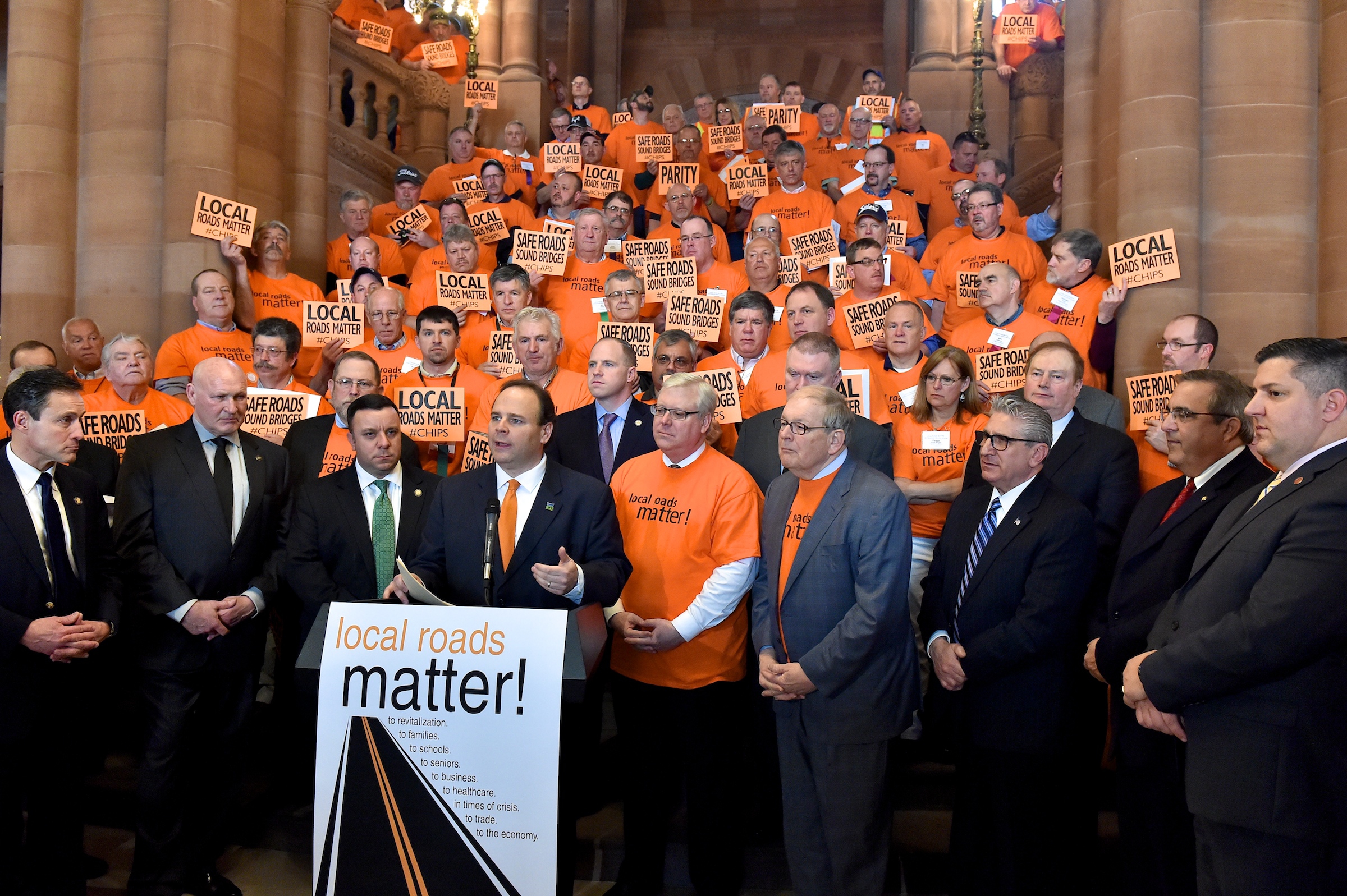 ALBANY, NY – State Senator Tom O’Mara (R, Big Flats) and Assemblyman Phil Palmesano (R, Corning) held a very large rally in Albany today, where 130 state lawmakers and hundreds of county and town highway superintendents, and other local leaders from across New York, called for increased state support for local roads, bridges and culverts.