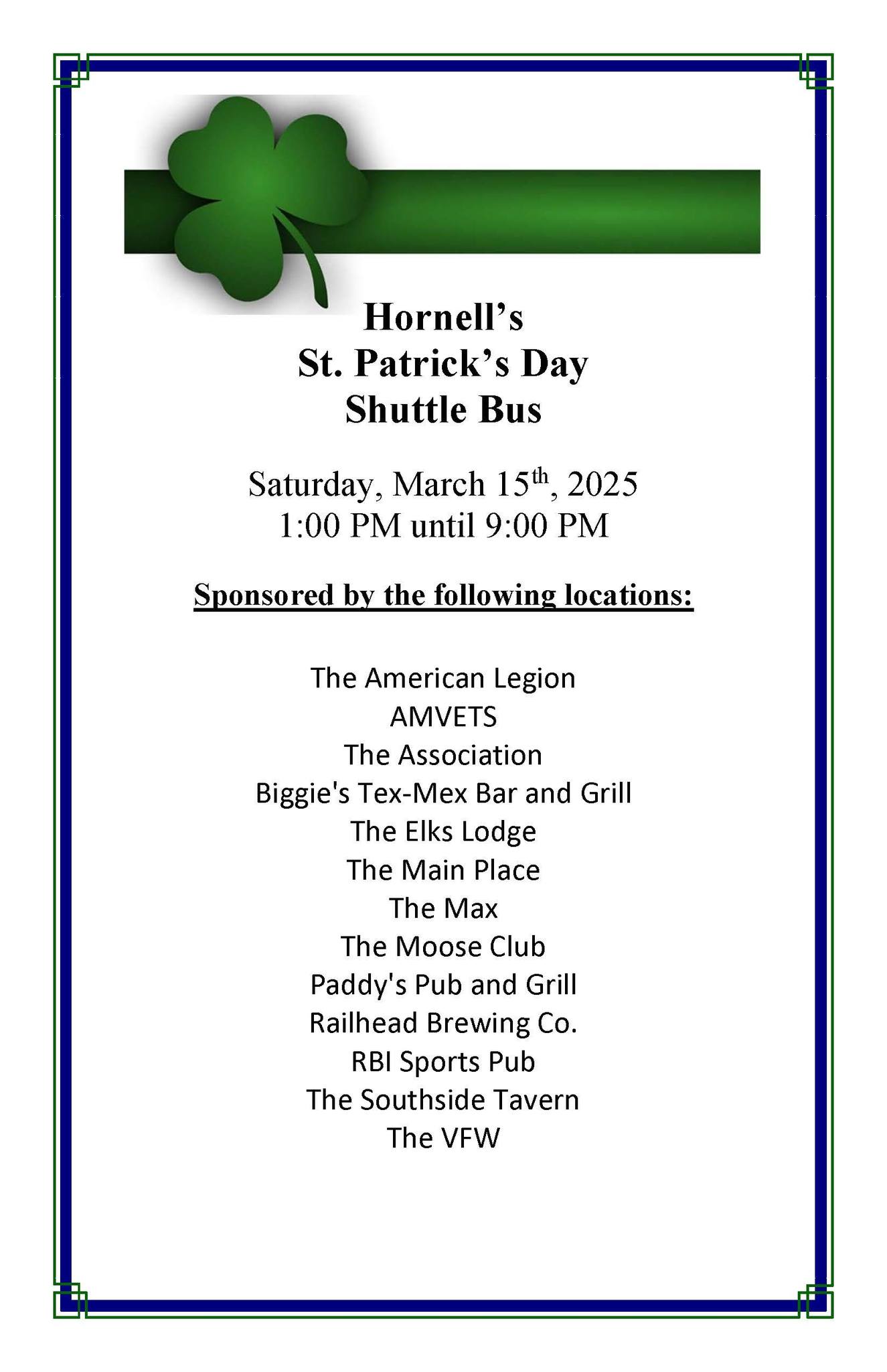The St. Patrick’s Day Shuttle Bus will be running again this year. Please see below for more information. Thank you to our local business for sponsoring this shuttle and to H.A.T. for coordinating the route and suppling the buses and drivers!