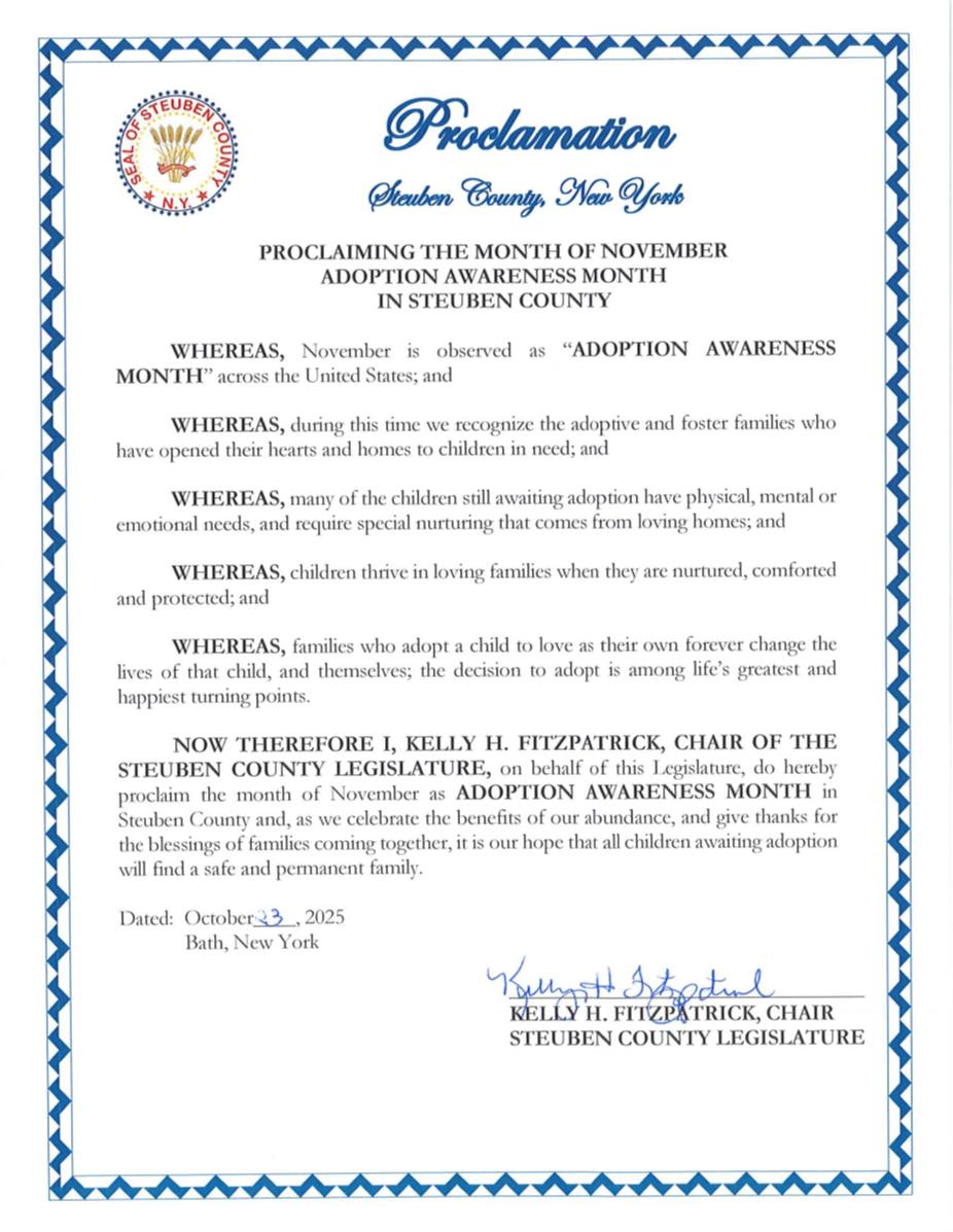 The Steuben County Legislature has officially proclaimed November as Adoption Awareness Month, honoring the remarkable families who open their hearts and homes to children through adoption.