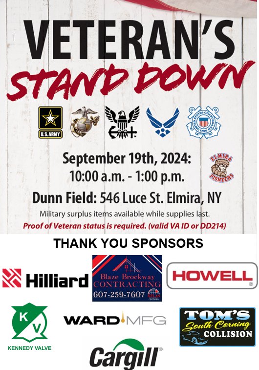 The VA is having a veterans event in Elmira today at Dunn Field, from 10:00 a.m.–1:00 p.m. Veterans will be able to apply for VA benefits as well as VA health care. They will also have free military surplus items, food from the Food Bank of the Southern Tier and a free lunch from the Elmira Pioneers.